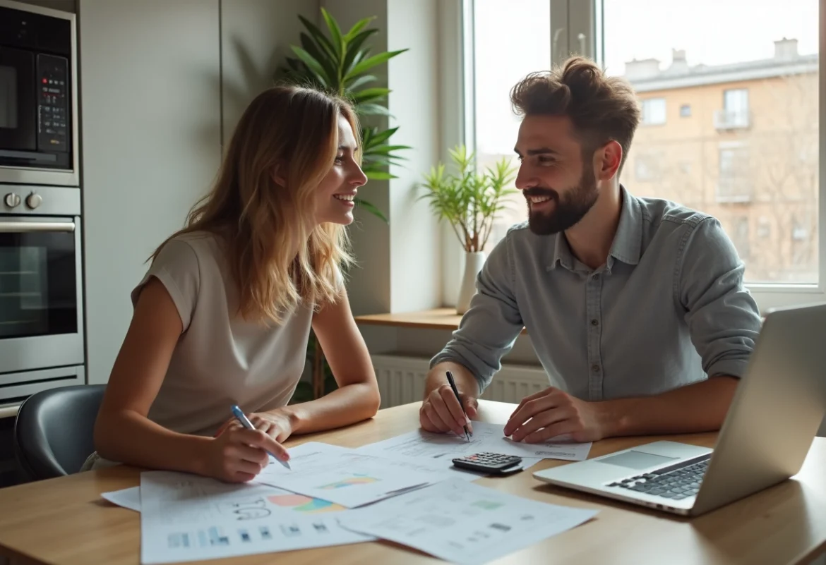 Jeune couple souriant avec documents de prêt immobilier
